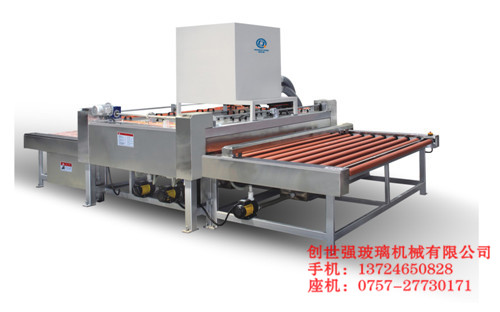 包括不銹鋼殼體、傳送輪、膠輥、毛刷、傳送支架、電控箱,不銹鋼殼體的側面玻璃入口處設有引輪,傳送支架上設有若干靠輪,傳送支架的下部設有并行排列且通過若干聯動片銜接的若干組傳送輪,玻璃清洗機內腔的另一側設有膠輥,膠輥的左側設有若干毛刷,靠近玻璃出口處設有風口。避免了二次清洗,有效的提高了產品清洗的工作效率;采用觸摸顯示屏操作系統,并可隨時監測設備運行和隨時監測設備故障;設備安裝調試快速、便捷,清洗機主體結構和內部采用不銹鋼材料;減少電耗。